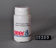 Abstract: Runde Dose aus weißem Kunststoff mit Sicherheits-Drehverschluss für Kapseln. Seitliche Naht. Boden mit geteiltem Standring. Deckel bedruckt mit Logo der Peer Apotheke, Brixen. Boden geprägt mit Volumenangabe 50 und Recycling-Code für PD-HE. Enthält 30 Kapseln Selen (Natrium Selenit) zu je 200µg. Zur Verwendung laut ärztlicher Verordnung.