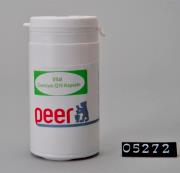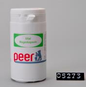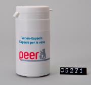 Abstract: Runde Dose aus weißem Kunststoff mit Sicherheits-Drehverschluss für Kapseln. Seitliche Naht. Boden mit geteiltem Standring. Deckel bedruckt mit Logo der Peer Apotheke, Brixen. Boden geprägt mit Volumenangabe EP 100 und Recycling-Code für PD-HE. Enthält 60 Kapseln.