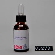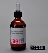 Abstract: Brauner, runder zylindrischer Flaschenkörper mit abfallender Schulter und Seitennaht. Mündungsrand verstärkt, mit Schraubgewinde. Schwarzer Drehverschluss aus Polypropylen (PP) mit Tropfenzähler aus farlosem Glas und Kunsstoffkappe aus Polyvinylchlorid (PVC). Bodenrand geriffelt. Bodenprägung: 50 und F 62. Wirkt entzündungshemmend.