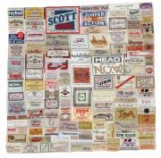 Abstract: Patchwork composto da etichette di indumenti a sfondo prevalentemente beige/grigio cucite insieme su un fazzoletto di cotone.
