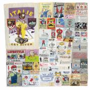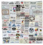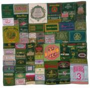 Abstract: Patchwork composto da etichette di indumenti a sfondo prevalentemente verde cucite insieme su un fazzoletto di cotone.