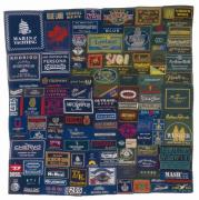 Abstract: Patchwork composto da etichette di indumenti a sfondo prevalentemente blu/nero cucite insieme su un fazzoletto di cotone.