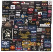 Abstract: Patchwork composto da etichette di indumenti a sfondo prevalentemente blu/verde cucite insieme su un fazzoletto di cotone.