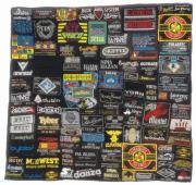 Abstract: Patchwork composto da etichette di indumenti a sfondo prevalentemente nero cucite insieme su un fazzoletto di cotone.