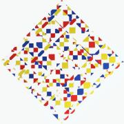 Abstract: Tela di cotone appesa ad un angolo con forme geometriche realizzate con pigmenti di colore rosso, blu e giallo. Le forme geometriche creano una leggera griglia diagonale.