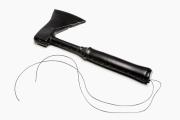 Abstract: Ascia di metallo rivestita in pelle nera. Lungo il manico il rivestimento è cucito a punto croce.