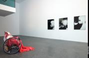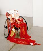 Abstract: Sedia in legno, ai cui lati sono state appoggiate due ruote di bicicletta. Sulla sedia sono stati disposti una stoffa (tenda) semitrasparente rossa, una stoffa plastificata rossa, vari nastri, nastro adesivo e pezzi di carta a specchio dorata, sui quali l'artista è intervenuta con lacca bianca.