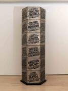 Abstract: "Scultura verbale" in metallo a sezione esagonale, composta da sei parti impilate. Sulla struttura sono state fissate trentasei lastre metalliche che recano a rilievo il poema di Nanni Balestrini dal titolo "Icaro": [prima sezione in basso, da destra a sinistra] IMPROVVISAMENTE CHE SI STAGLIA NEL CIELO A ZZURRO CHIUDE LE ALI A METÀ E VEDENDO OMBR A SUL MARE VENATO E AZZURRO CHE SI STENDE VA ALL' OMBRA DELLE ALI L'OMBRA DEL CIELO S UL MARE LUCCICA ALI DI VETRO NEL CIELO CIE CO FISSANDO IL SOLE CHE SOFFIA NEI CAPELLI [seconda sezione dal basso, da destra a sinistra] IN CIMA AL CIELO RESPIRA L'ARIA IMMOBILE L'OCCHIO VEDE TUTTO E VEDENDO CHE MERITO E RA FUGGITO ALI SOTTILI E APPUNTITE NEL CIE LO AZZURRO DELL'OCEANO E PIACERE ADDORMENT ATO BIANCO IMMACOLATO NEL PIUMAGGIO E GIOC O D'AMORE MORTO VOLANDO IN LINEA SPEZZATA [terza sezione dal basso, da destra a sinistra] E VALORE FALLITO TRA LE CORRENTI AEREE UTI LIZZANDO LE DIFFERENZE DI VELOCITÀ E CORTE SIA PERDUTA E I MOVIMENTI DELL'ARIA E DOTT RINA VOLTA A VILLANIA CHE SI LASCIA PORTAR E DAL VENTO E CHE L'INGANNO SI ERA ORMAI I NSINUATO NERO DI GIADA CHE ORLA LE LUNGHE [quarta sezione dal basso, da destra a sinistra] ALI SOTTILI NELLE AMANTI COME NEGLI AMANTI VOLLE FARE UNO SFORZO PER RECUPERARE PIAC ERE E GIOIA E SCRISSE QUESTA CANZONE CHE D ICE IMPROVVISAMENTE CHIUSE LE ALI A METÀ P UNTO DI FUGA SULLA LINEA DELL'ORIZZONTE SO FFIO INFUOCATO AI CONFINI DELL'ACQUA PIÙ P [quinta sezione dal basso, da destra a sinistra] ROFONDA NON IL DESIDERIO MA IL MOVIMENTO F UOCO E ACQUA E TERRA E SCONFINATA ALTEZZA DELL'ARIA OCCUPÒ D'IMPROVVISO TUTTO LO SPA ZIO SI SPOGLIA DELLE ALI NON È MA DIVIENE SULL'OCEANO POPOLATO D'OMBRE IL SOLE CAPOV OLGE IL SUO CORSO PIOMBO NELLE ALI VISTO D [sesta sezione dal basso, da destra a sinistra] ALL'ALTO IL BERSAGLIO È INQUADRATO SULLA S CHIUMA BIANCA IMMACOLATA SI SFOGLIA NEL CI ELO AZZURRO VISTO DAL BASSO DIAGONALE TAG LIANDO LA LINEA DELL'ORIZZONTE GRANDI ALI NEL VENTO DA MILLE MIGLIA D'ALTEZZA TRAFIG GE LA SUPERFICIE IN UNO SPRUZZO DI SCHIUMA. Sopra e sotto le righe del poema sono presenti frammenti dello stesso poema scritto a caratteri di diverso tipo, altezza e spessore. La colonna è stata esposta alla XLV Biennale di Venezia, 1993.