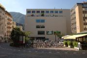 Abstract: Blick von der Sernesistraße auf das "Alte Spital" neben dem Neubau der Freien Universität Bozen, an der Fassade ein Banner mit der Aufschrift "Museion"