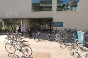 Abstract: Gruppe von Studierenden und abgestellte Fahrrädern auf dem Platz vor dem Hauptgebäude der Freien Universität Bozen