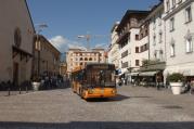 Abstract: Öffentlicher Linienbus fährt über den Dominikanerplatz in Bozen Richtung Waltherplatz