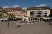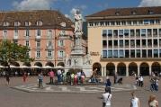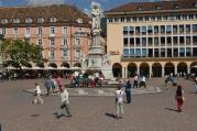 Abstract: Serie von Aufnahmen des Waltherplatzes mit dem Denkmal des Walther von der Vogelweide und Passanten, im Hintergrund das Hotel Città und die Sparkasse