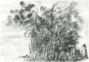 Abstract: Karikatur in Faser-, Buntstift und Aquarell von Anton Frühauf. Motiv: Ein Paar liegt unter einem großen Weidenbaum.