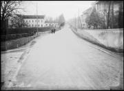 Abstract: Ripresa in esterno. Strada in un paese. Al basso l'ombra del fotografo e della sua fotocamera. Duo uomini in uniforme