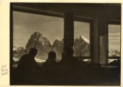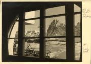 Abstract: Blick durch ein Fenster eines Hotels auf die Langkofelgruppe (Panorama).