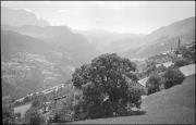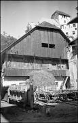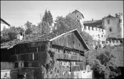 Abstract: Obermair (Obermoar) in Ehrenburg (Kiens) im Jahr 1936, in Richtung Nordwesten fotografiert, im Bild das Futterhaus, das mit dem Feuerhaus über Eck zusammengebaut war; im Hintergrund Schloss Ehrenburg.