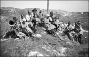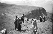 Abstract: Pause bei der Heumahd; Männer, Frauen und Kinder mit Rechen, die Männer und Jungen spielen auf Blasinstrumenten (Klarinette, Horn, Trompete, Bariton); im Hintergrund die St. Kassian-Kapelle am Schlern.