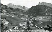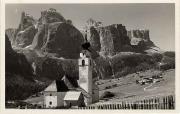 Abstract: Ausschnitt von Kolfuschg mit Pfarrkirche (vorne im Bild) gegen Abschnitt der Sellagruppe, im Sommer.