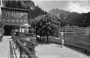 Abstract: Veranda und Parkplatz mit Tankstelle des Hotels Bad Altprags, im Sommer.