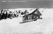Abstract: Skihütte am Golfen/Monte Calvo (ca. 2100 m.) mit hohem Schnee und einigen Skifahrern.