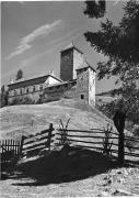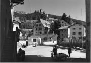 Abstract: Dorfplatz von Sarnthein, mit Schafen und einigen Menschen, gegen Schloß Reinegg.