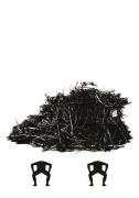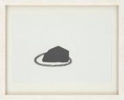 Abstract: Disegno a china. Due motivi a forma di sagoma posti uno sopra l’altro su foglio bianco: capanna costuita di rami, due persone visti dal retro in posizione china, le braccia appoggiate sulle coscie.