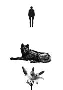 Abstract: Disegno a china. Tre motivi a forma di sagoma posti uno sopra l’altro su foglio bianco: uomo in piedi, lupo sdraiato, fiore di giglio.