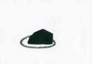 Abstract: Disegno e collage. Prisma a tre lati di carta vetrata nera incollata sul foglio, sta in un cerchio nero tratteggiato. Sul retro in basso titolo, data e firma d’autore scritti a mano con grafite fina: “O.T. 2016 Kathrin Partelli”.