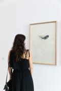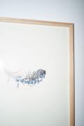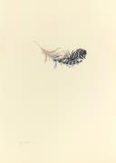 Abstract: Piuma di una ghiandaia con strisce blu, bianche e nere. In basso a destra firma d’autore scritta a mano con penna a sfera nera: "Sylvia Barbolini". Opera corredata di didascalie su targhetta di forex.