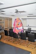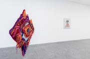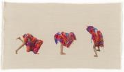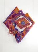 Abstract: Tapezzeria su cornice d'acciaio, 2016, da appendere liberamente nel vano oppure al muro. L´oggetto tessile funziona come requisito, costume o ogetto da appendere. È un pezzo unico realizzato nell'arco di tre mesi. All'opera appartengono tre stampe tessili, fotografie a colori su lino, come documentazione della performance del 2016 nel college Goldsmiths di Londra, stampato nel 2018. Edizione limitata di 10 pezzi (+2 AP).