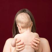 Abstract: 3 fotografie a colori dalla serie "Mothers". Busti di madri con i loro figli piccoli davanti a un fondo rosso scuro.