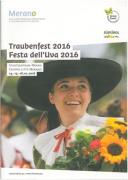 Abstract: Opuscolo pubblicitario inerente la festa dell'uva svoltasi il 14. 15. e 16 ottobre 2016 a Merano. Motivo fotografico di copertina: donna in tipico costume tradizionale con cappello e bouquet (girasoli).