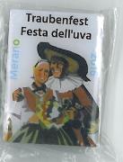 Abstract: Distintivo a spilla, rettangolare, inerente la "Festa dell'uva 2016" -Merano. Motivo grafico: Coppia in tipico costume tradizionale - di Franz Lenhart (ripr. Manifesto / Festa in costume tradizionale - 1959).
