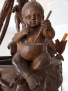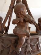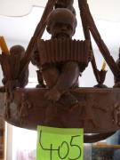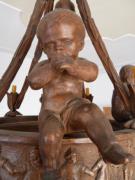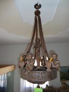 Abstract: Hängeleuchter aus Holz mit vier Kerzen und insgesamt fünf Figuren: vier musizierende Kinder und ein Lesendes in der Mitte. Unterer, runder Kranz mit eingeschnitzten, musizierenden Kindern.