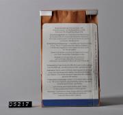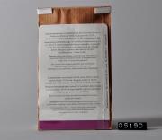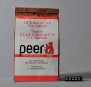 Abstract: Stehbodensack mit Cellophan: brauner 2-lagiger Blockbodenbeutel mit zwei Seitenfalten und einem festen Bodenblatt, bestehend aus braunem, ungebleichtem Kraftpapier und Cellophan (Polypropylen, transparent) für Kräutermischungen. Befüllt mit "Gute Nachttee für Kinder". Zwischen den beiden Lagen des Säckchens: auf der Vorderseite eingeschobenes Etikett mit Produktnamen, Verwendung, sowie Logo der Peer-Apotheken Brixen und Lana, auf der Rückseite Einschub mit Zusammensetzung, Gebrauchsanleitung und Warnhinweisen. Mündung gefalzt und verschlossen mit einem ca 11 cm langen Verschlussstreifen aus weißem, mit Draht verstärktem Papier. Am Boden selbstklebendes Schild mit Herstellungsdatum, Chargennummer, Aufbrauchfrist, Preis und Barcode.