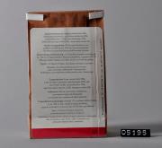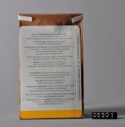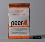 Abstract: Stehbodensack mit Cellophan: brauner 2-lagiger Blockbodenbeutel mit zwei Seitenfalten und einem festen Bodenblatt, bestehend aus braunem, ungebleichtem Kraftpapier und Cellophan (Polypropylen, transparent) für Kräutermischungen. Befüllt mit Brust- und Hustentee. Zwischen den beiden Lagen des Säckchens: auf der Vorderseite eingeschobenes Etikett mit Produktnamen, Verwendung, sowie Logo der Peer-Apotheken Brixen und Lana, auf der Rückseite Einschub mit Zusammensetzung, Gebrauchsanleitung und Warnhinweisen. Mündung gefalzt und verschlossen mit einem ca 11 cm langen Verschlussstreifen aus weißem, mit Draht verstärktem Papier. Am Boden selbstklebendes Schild mit Herstellungsdatum, Chargennummer, Aufbrauchfrist, Preis und Barcode.