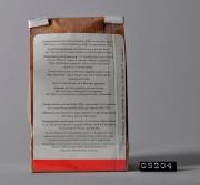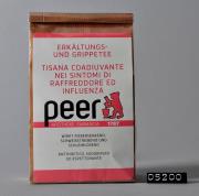 Abstract: Stehbodensack mit Cellophan: brauner 2-lagiger Blockbodenbeutel mit zwei Seitenfalten und einem festen Bodenblatt, bestehend aus braunem, ungebleichtem Kraftpapier und Cellophan (Polypropylen, transparent) für Kräutermischungen. Befüllt mit Erkältungs- und Grippetee. Zwischen den beiden Lagen des Säckchens: auf der Vorderseite eingeschobenes Etikett mit Produktnamen, Verwendung, sowie Logo der Peer-Apotheken Brixen und Lana, auf der Rückseite Einschub mit Zusammensetzung, Gebrauchsanleitung und Warnhinweisen. Mündung gefalzt und verschlossen mit einem ca 11 cm langen Verschlussstreifen aus weißem, mit Draht verstärktem Papier. Am Boden selbstklebendes Schild mit Herstellungsdatum, Chargennummer, Aufbrauchfrist, Preis und Barcode.