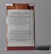 Abstract: Stehbodensack mit Cellophan: brauner 2-lagiger Blockbodenbeutel mit zwei Seitenfalten und einem festen Bodenblatt, bestehend aus braunem, ungebleichtem Kraftpapier und Cellophan (Polypropylen, transparent) für Kräutermischungen. Befüllt mit Cholesterinregulativtee. Zwischen den beiden Lagen des Säckchens: auf der Vorderseite eingeschobenes Etikett mit Produktnamen, Verwendung, sowie Logo der Peer-Apotheken Brixen und Lana, auf der Rückseite Einschub mit Zusammensetzung, Gebrauchsanleitung und Warnhinweisen. Mündung gefalzt und verschlossen mit einem ca 11 cm langen Verschlussstreifen aus weißem, mit Draht verstärktem Papier. Am Boden selbstklebendes Schild mit Herstellungsdatum, Chargennummer, Aufbrauchfrist, Preis und Barcode.