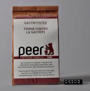 Abstract: Stehbodensack mit Cellophan: brauner 2-lagiger Blockbodenbeutel mit zwei Seitenfalten und einem festen Bodenblatt, bestehend aus braunem, ungebleichtem Kraftpapier und Cellophan (Polypropylen, transparent) für Kräutermischungen. Befüllt mit Gastritistee. Zwischen den beiden Lagen des Säckchens: auf der Vorderseite eingeschobenes Etikett mit Produktnamen, Verwendung, sowie Logo der Peer-Apotheken Brixen und Lana, auf der Rückseite Einschub mit Zusammensetzung, Gebrauchsanleitung und Warnhinweisen. Mündung gefalzt und verschlossen mit einem ca 11 cm langen Verschlussstreifen aus weißem, mit Draht verstärktem Papier. Am Boden selbstklebendes Schild mit Herstellungsdatum, Chargennummer, Aufbrauchfrist, Preis und Barcode.