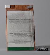 Abstract: Stehbodensack mit Cellophan: brauner 2-lagiger Blockbodenbeutel mit zwei Seitenfalten und einem festen Bodenblatt, bestehend aus braunem, ungebleichtem Kraftpapier und Cellophan (Polypropylen, transparent) für Kräutermischungen. Befüllt mit Gesundheitstee. Zwischen den beiden Lagen des Säckchens: auf der Vorderseite eingeschobenes Etikett mit Produktnamen, Verwendung, sowie Logo der Peer-Apotheken Brixen und Lana, auf der Rückseite Einschub mit Zusammensetzung, Gebrauchsanleitung und Warnhinweisen. Mündung gefalzt und verschlossen mit einem ca 11 cm langen Verschlussstreifen aus weißem, mit Draht verstärktem Papier. Am Boden selbstklebendes Schild mit Herstellungsdatum, Chargennummer, Aufbrauchfrist, Preis und Barcode.