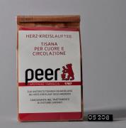 Abstract: Stehbodensack mit Cellophan: brauner 2-lagiger Blockbodenbeutel mit zwei Seitenfalten und einem festen Bodenblatt, bestehend aus braunem, ungebleichtem Kraftpapier und Cellophan (Polypropylen, transparent) für Kräutermischungen. Befüllt mit Herz- und Kreislauftee. Zwischen den beiden Lagen des Säckchens: auf der Vorderseite eingeschobenes Etikett mit Produktnamen, Verwendung, sowie Logo der Peer-Apotheken Brixen und Lana, auf der Rückseite Einschub mit Zusammensetzung, Gebrauchsanleitung und Warnhinweisen. Mündung gefalzt und verschlossen mit einem ca 11 cm langen Verschlussstreifen aus weißem, mit Draht verstärktem Papier. Am Boden selbstklebendes Schild mit Herstellungsdatum, Chargennummer, Aufbrauchfrist, Preis und Barcode.