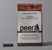 Abstract: Stehbodensack mit Cellophan: brauner 2-lagiger Blockbodenbeutel mit zwei Seitenfalten und einem festen Bodenblatt, bestehend aus braunem, ungebleichtem Kraftpapier und Cellophan (Polypropylen, transparent) für Kräutermischungen. Befüllt mit Leber- Galletee. Zwischen den beiden Lagen des Säckchens: auf der Vorderseite eingeschobenes Etikett mit Produktnamen, Verwendung, sowie Logo der Peer-Apotheken Brixen und Lana, auf der Rückseite Einschub mit Zusammensetzung, Gebrauchsanleitung und Warnhinweisen. Mündung gefalzt und verschlossen mit einem ca 11 cm langen Verschlussstreifen aus weißem, mit Draht verstärktem Papier. Am Boden selbstklebendes Schild mit Herstellungsdatum, Chargennummer, Aufbrauchfrist, Preis und Barcode.