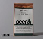 Abstract: Stehbodensack mit Cellophan: brauner 2-lagiger Blockbodenbeutel mit zwei Seitenfalten und einem festen Bodenblatt, bestehend aus braunem, ungebleichtem Kraftpapier und Cellophan (Polypropylen, transparent) für Kräutermischungen. Befüllt mit Magentee. Zwischen den beiden Lagen des Säckchens: auf der Vorderseite eingeschobenes Etikett mit Produktnamen, Verwendung, sowie Logo der Peer-Apotheken Brixen und Lana, auf der Rückseite Einschub mit Zusammensetzung, Gebrauchsanleitung und Warnhinweisen. Mündung gefalzt und verschlossen mit einem ca 11 cm langen Verschlussstreifen aus weißem, mit Draht verstärktem Papier. Am Boden selbstklebendes Schild mit Herstellungsdatum, Chargennummer, Aufbrauchfrist, Preis und Barcode.