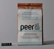 Abstract: Stehbodensack mit Cellophan: brauner 2-lagiger Blockbodenbeutel mit zwei Seitenfalten und einem festen Bodenblatt, bestehend aus braunem, ungebleichtem Kraftpapier und Cellophan (Polypropylen, transparent) für Kräutermischungen. Befüllt mit Nerven- und Beruhigungstee. Zwischen den beiden Lagen des Säckchens: auf der Vorderseite eingeschobenes Etikett mit Produktnamen, Verwendung, sowie Logo der Peer-Apotheken Brixen und Lana, auf der Rückseite Einschub mit Zusammensetzung, Gebrauchsanleitung und Warnhinweisen. Mündung gefalzt und verschlossen mit einem ca 11 cm langen Verschlussstreifen aus weißem, mit Draht verstärktem Papier. Am Boden selbstklebendes Schild mit Herstellungsdatum, Chargennummer, Aufbrauchfrist, Preis und Barcode.