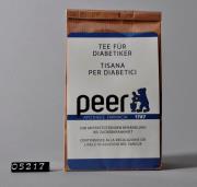 Abstract: Stehbodensack mit Cellophan: brauner 2-lagiger Blockbodenbeutel mit zwei Seitenfalten und einem festen Bodenblatt, bestehend aus braunem, ungebleichtem Kraftpapier und Cellophan (Polypropylen, transparent) für Kräutermischungen. Befüllt mit Tee für Diabetiker. Zwischen den beiden Lagen des Säckchens: auf der Vorderseite eingeschobenes Etikett mit Produktnamen, Verwendung, sowie Logo der Peer-Apotheken Brixen und Lana, auf der Rückseite Einschub mit Zusammensetzung, Gebrauchsanleitung und Warnhinweisen. Mündung gefalzt und verschlossen mit einem ca 11 cm langen Verschlussstreifen aus weißem, mit Draht verstärktem Papier. Am Boden selbstklebendes Schild mit Herstellungsdatum, Chargennummer, Aufbrauchfrist, Preis und Barcode.
