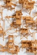 Abstract: Una rete di piccole case di legno collegate da scale e scale è fissata ad un pezzo di muro. Si diffonde in tutte le direzioni, sembra che non ci siano né inizio né fine. L'artista gioca con il concetto di spazio, vita e casa. La casa è lo spazio in cui le persone vivono: combinando i modelli in legno delle case tra loro, creano uno spazio sociale e urbano.