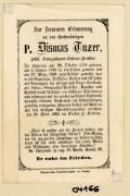 Abstract: Sterbebild von P. Dismas Tuzer, jubil. Franziskaner-Ordens-Priester Geb. am 28.10.1779 in Unterinn, gest. am 29.09.1856 in Kaltern ohne Foto