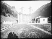 Abstract: Ripresa in esterno. Centrale elettrica, binari, due piloni di alta tensione. Al basso l'ombra del fotografo e della sua fotocamera