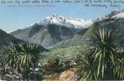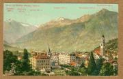 Abstract: Meran - Stadtansicht mit dem Kloster der Englischen Fräulein, dem Hotel Erzherzog Johann (heute Esplanade) und der Pfarrkirche im Vordergrund