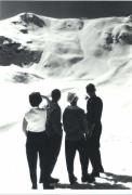 Abstract: Zwei Männer und zwei Frauen im oberen Suldental gegen schneebedeckte Fläche.